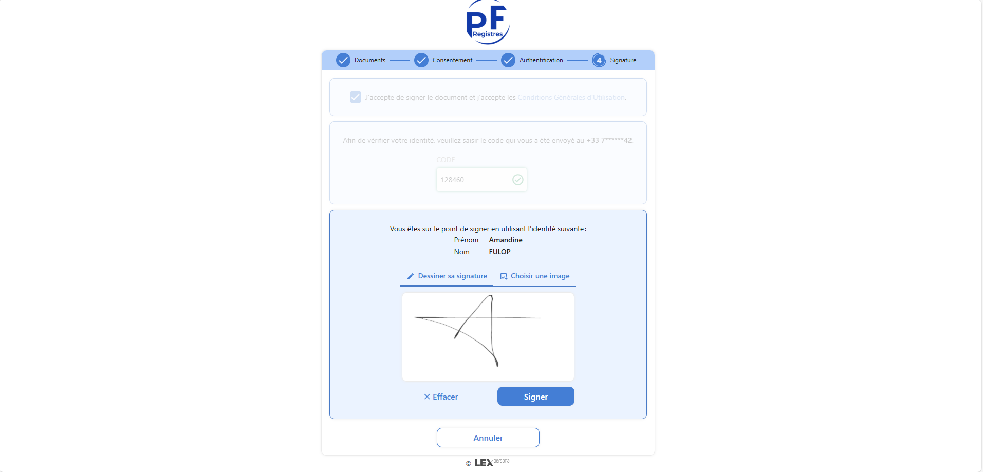 Une fois le code saisi, je peux apposer ma signature soit en la dessinant au doigt/souris soit en important une image (perte de qualité possible).