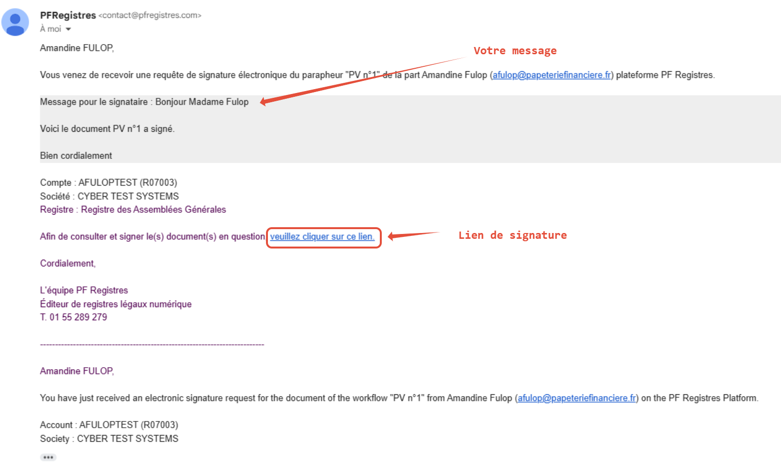 Une fois le document signé par toutes les parties, l'expéditeur reçoit un email indiquant la fin du paraphe.