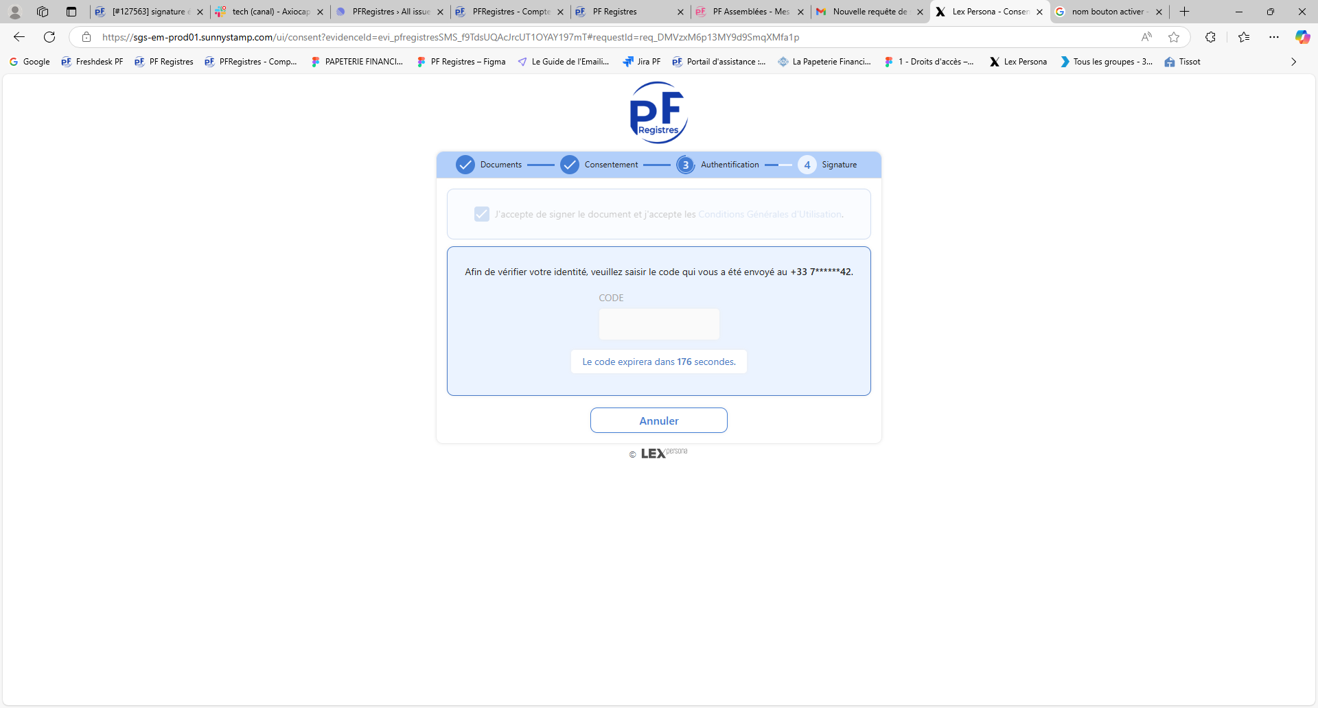 Aussitôt, un SMS est envoyé au signataire avec un code de validation à 6 chiffres, à renseigner dans la section qui est apparue.