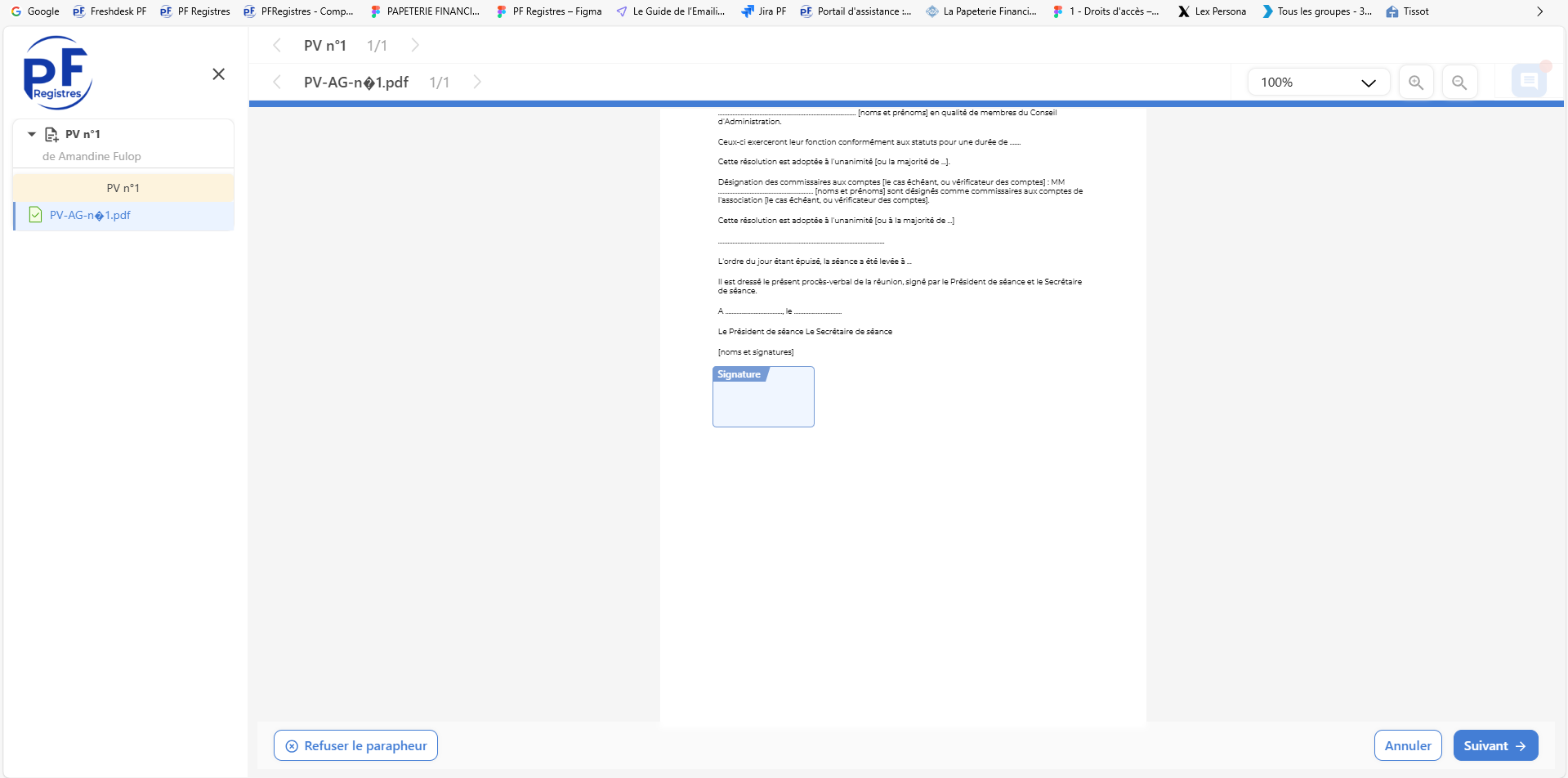 Il faut dérouler l'intégralité du document pour pouvoir passer à l'étape suivante.Si toutefois le PV contenait une erreur, c'est à cette étape que le signataire pourrait refuser la signature (en bas à gauche).