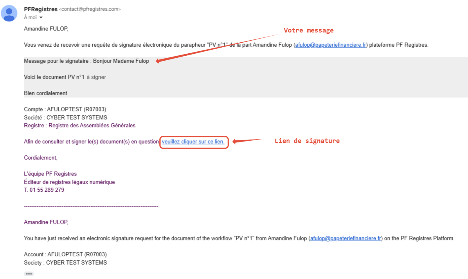 Une fois le document signé par toutes les parties, l'expéditeur reçoit un email indiquant la fin du processus de signature.